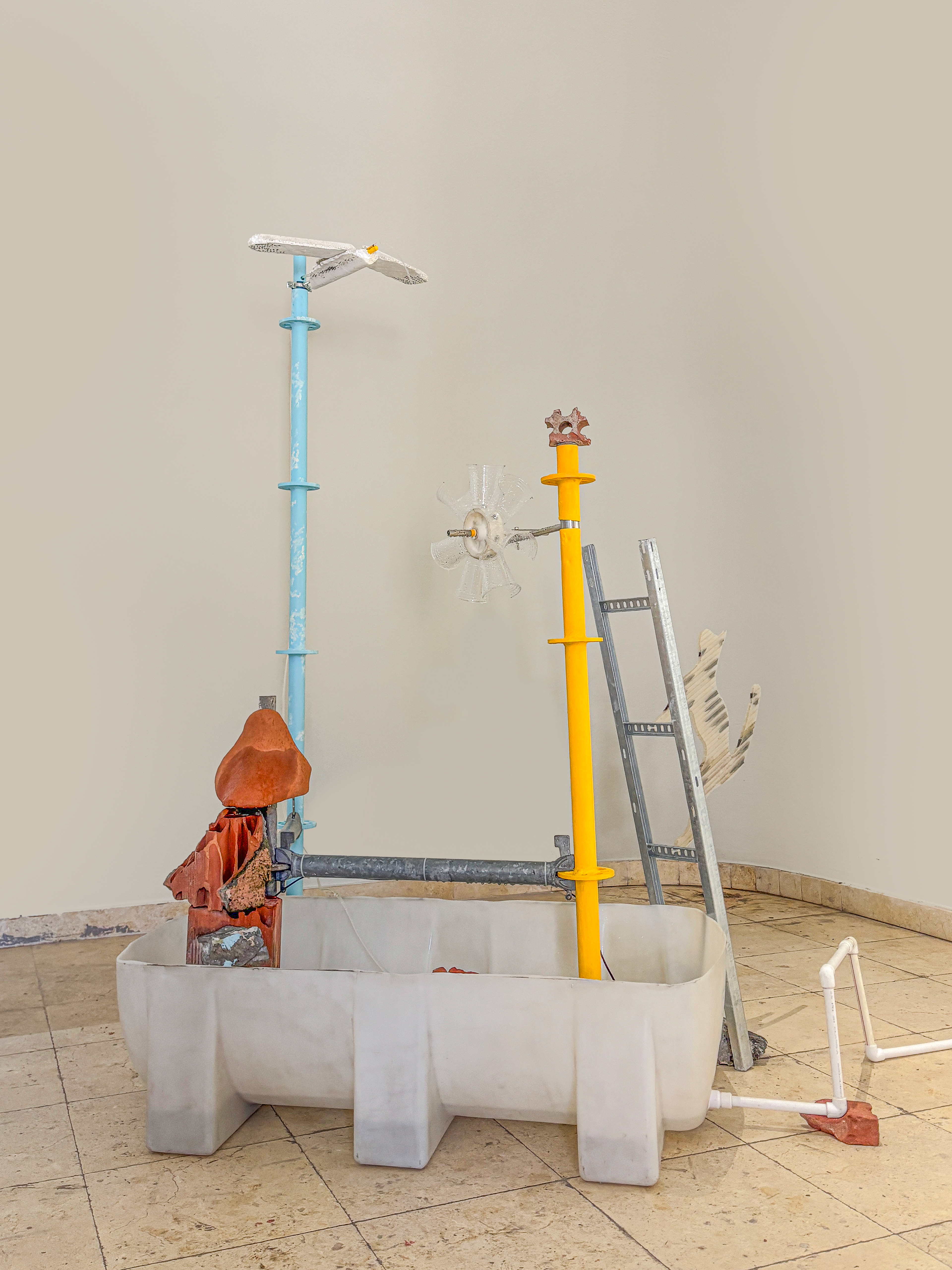 Şarman’ın 2024 yılında Pasaj x Barın Han’da gerçekleştirdiği Çeşme Yaratığı sergisinde şehirden topladığı molozları birleştirirken, sarnıç gibi tarihi su yapılarında kullanılan, kırık kiremitlerden harmanlanan horasan harcına dikkat çeker. Sanatçının su ile kurduğu ilişki bir şelaleden aldığı kalıplardan şehirden toplanmış molozlara doğru uzanan bir genişliğe erişir.